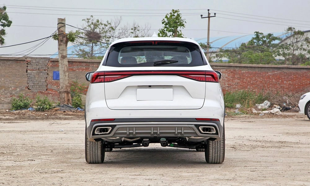 Открытый выхлоп, разнесенные две трубы с левой и правой стороны с прямоугольной накладкой в бампере